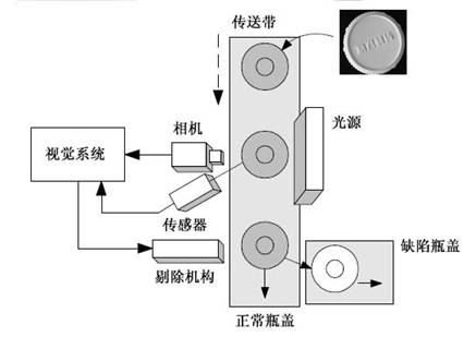 系统主要针对国内瓶盖人工检测存在稳定性差、效率低、技术含量低等问题。利用计算机视觉、光学图像、数字图像处理、智能控制等技术,对瓶盖质量进行实时在线检测。检测系统主要由光源、摄像机、图像处理计算机、PLC控制器等组成。系统示意图如下图1所示。