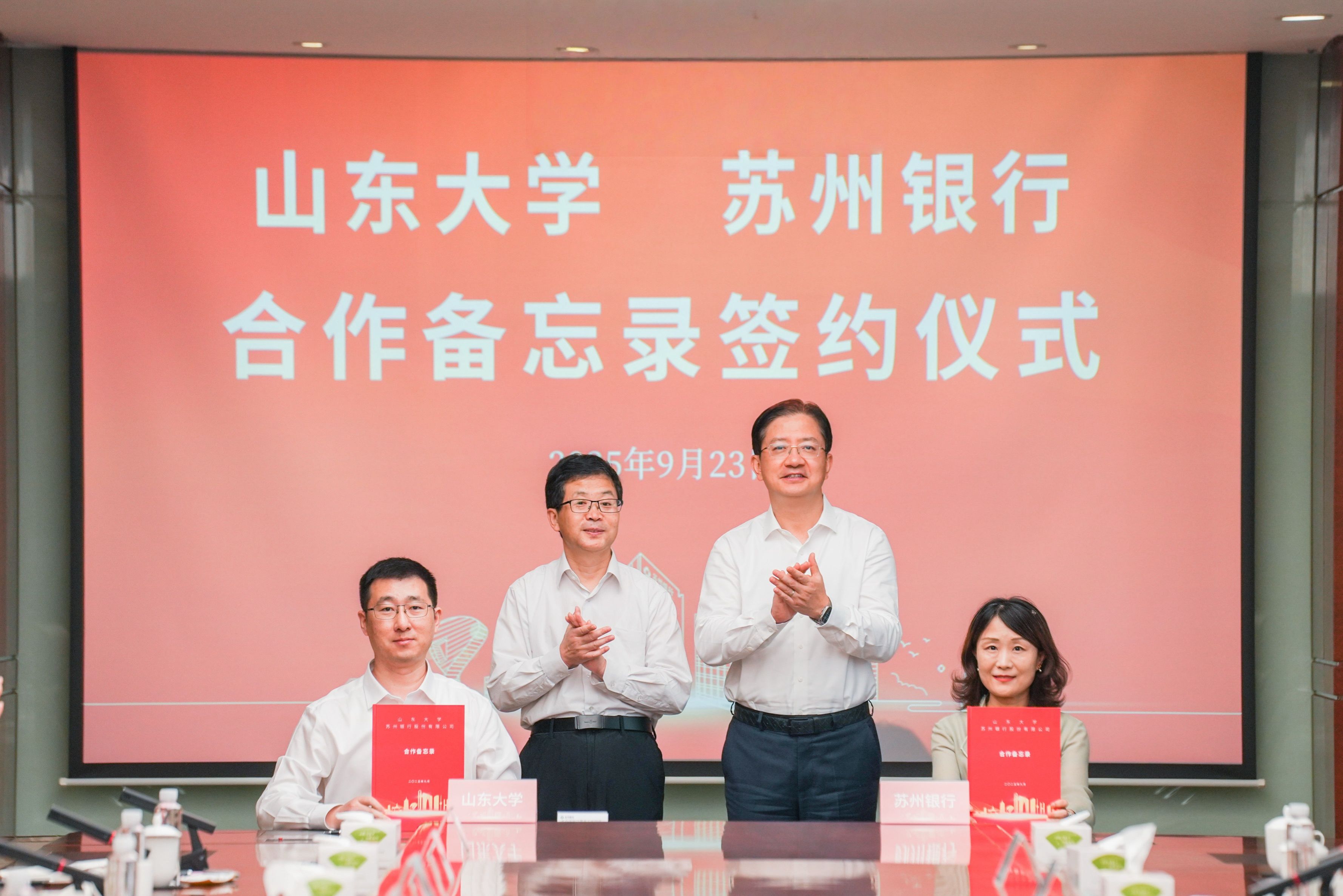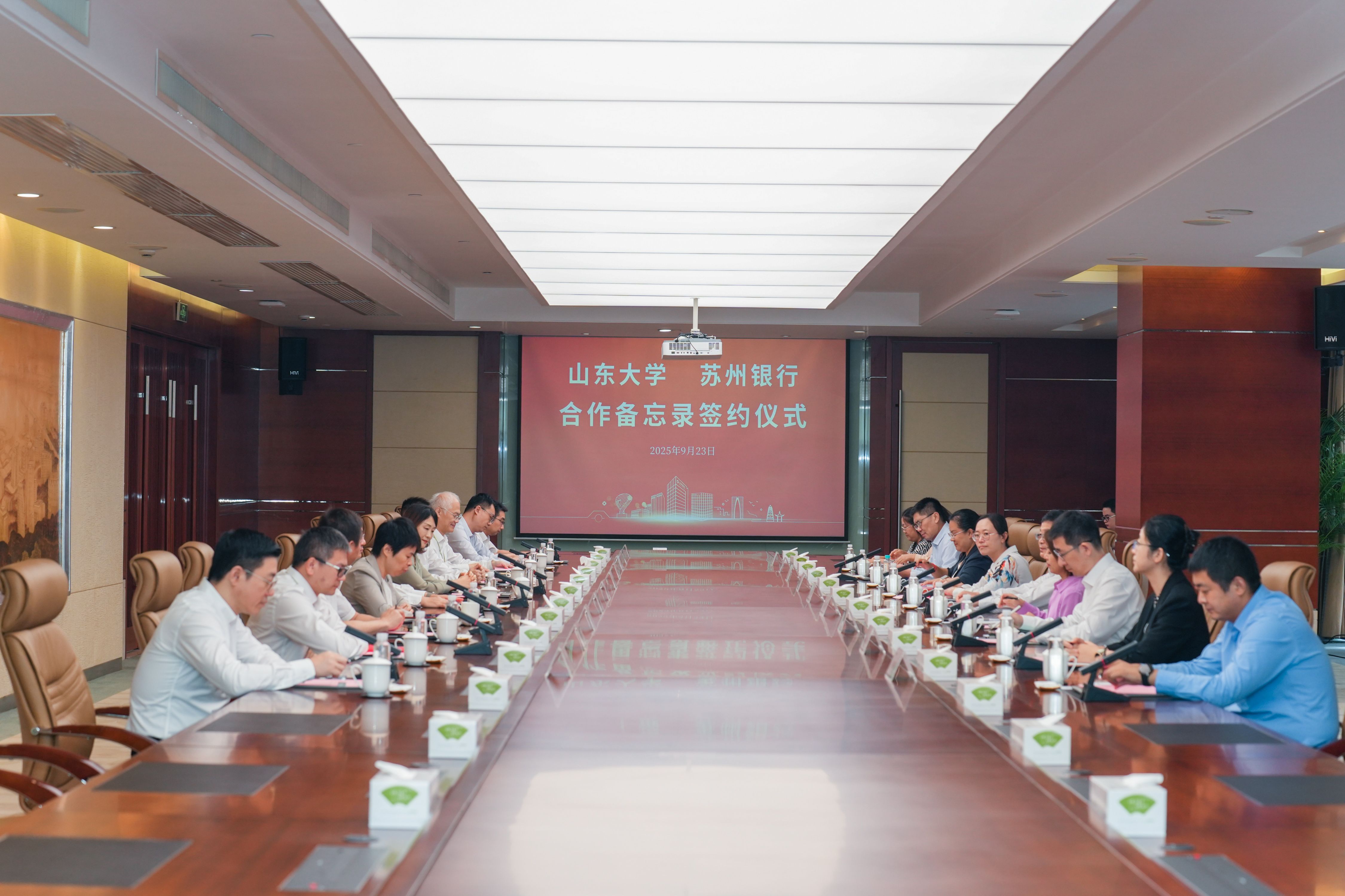 仪式上,山东大学合作发展部副部长蒋红光、苏州银行业务总监陈洁代表双方签署合作备忘录。与会人员观看了双方宣传片并围绕合作内容进行讨论交流。
